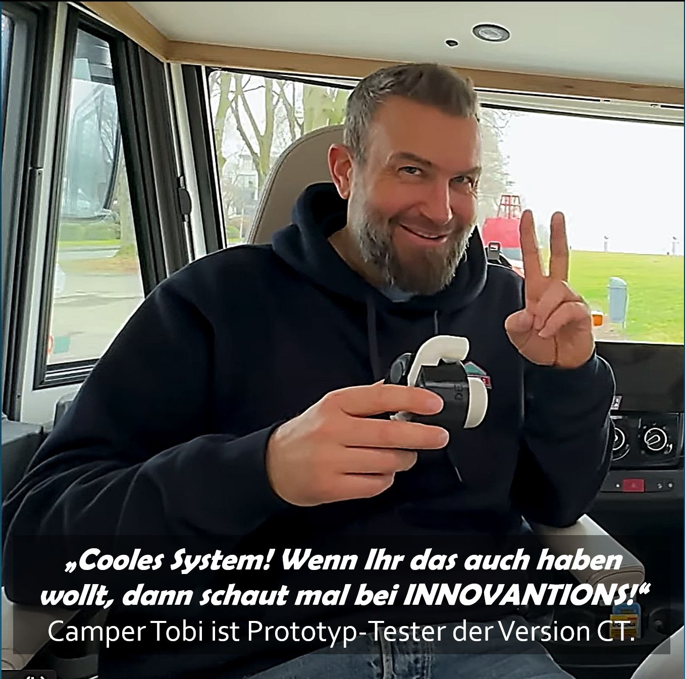 Die neue Version "CT" (nach Camper Tobi, der der erste Prototyp-Tester war) kann ohne Werkzeug und ohne Magneten als Ersatz-Revisionsdeckel eingeschraubt werden - geeignet für alle obenliegenden Standard-Wassertank-Revisionsdeckel mit Schraubgewinde und Durchmesser 120mm (siehe Fotos).
