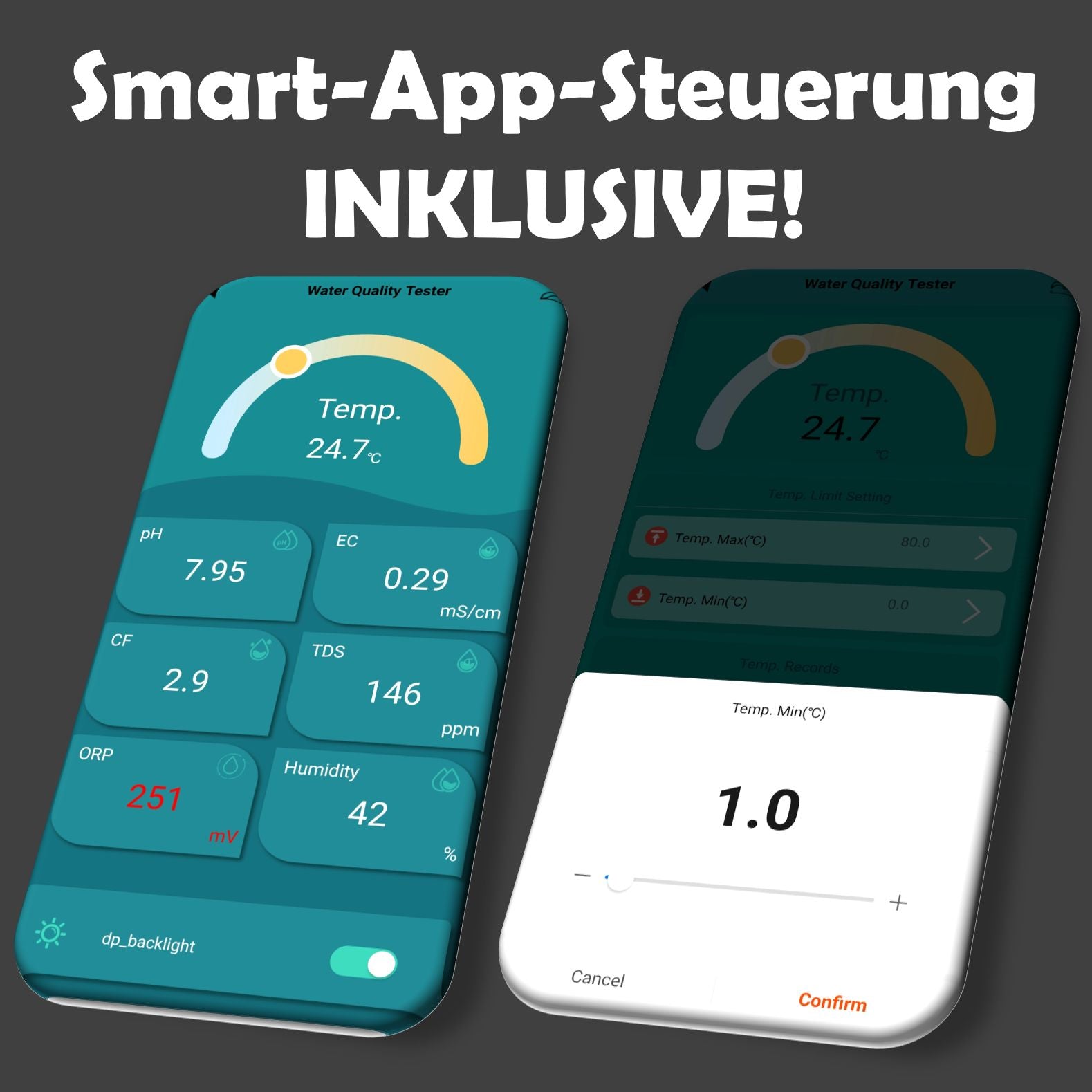 Diese und noch mehr Werte kann Dein neuer WQM messen und überwachen – sogar mit Deinem Smartphone verbunden und mit Alarmfunktion ausgestattet: Wenn ein Wert die zulässigen Korridore verlässt, wirst Du informiert!